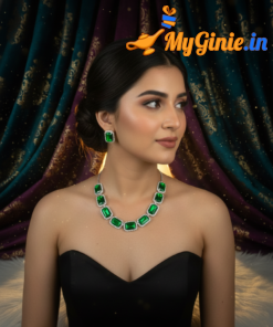 Square Shaped Silver Toned American Diamond Stone Studded Necklace With Earring Green