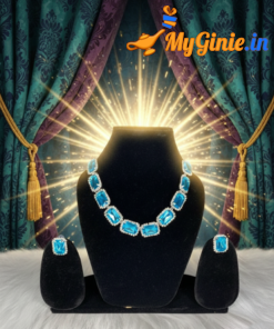 Square Shaped Silver Toned American Diamond Stone Studded Necklace With Earring Light Blue