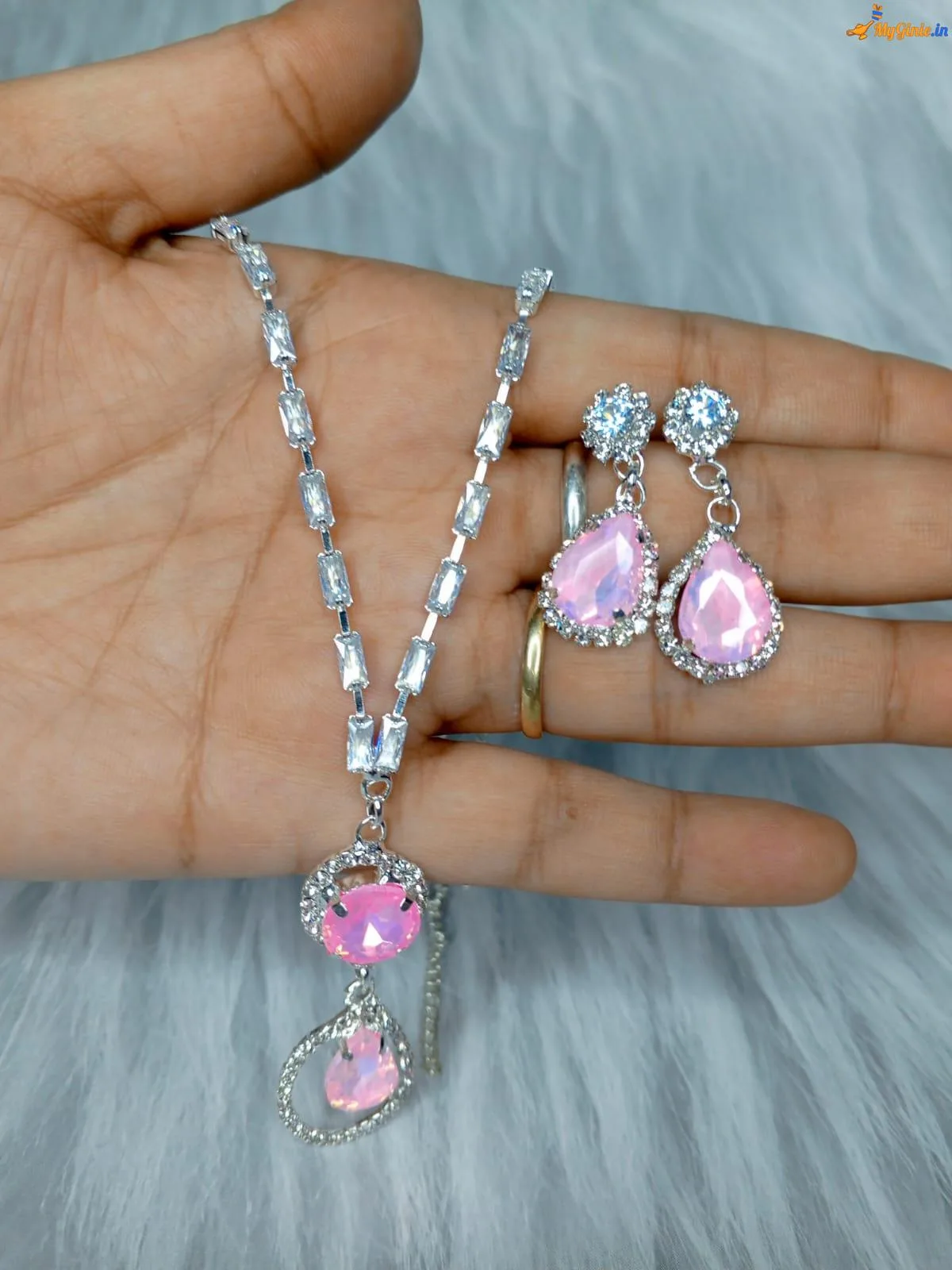 AD Stones Studded Long Sleek Necklace With Earring Jewellery Set For Women Pink