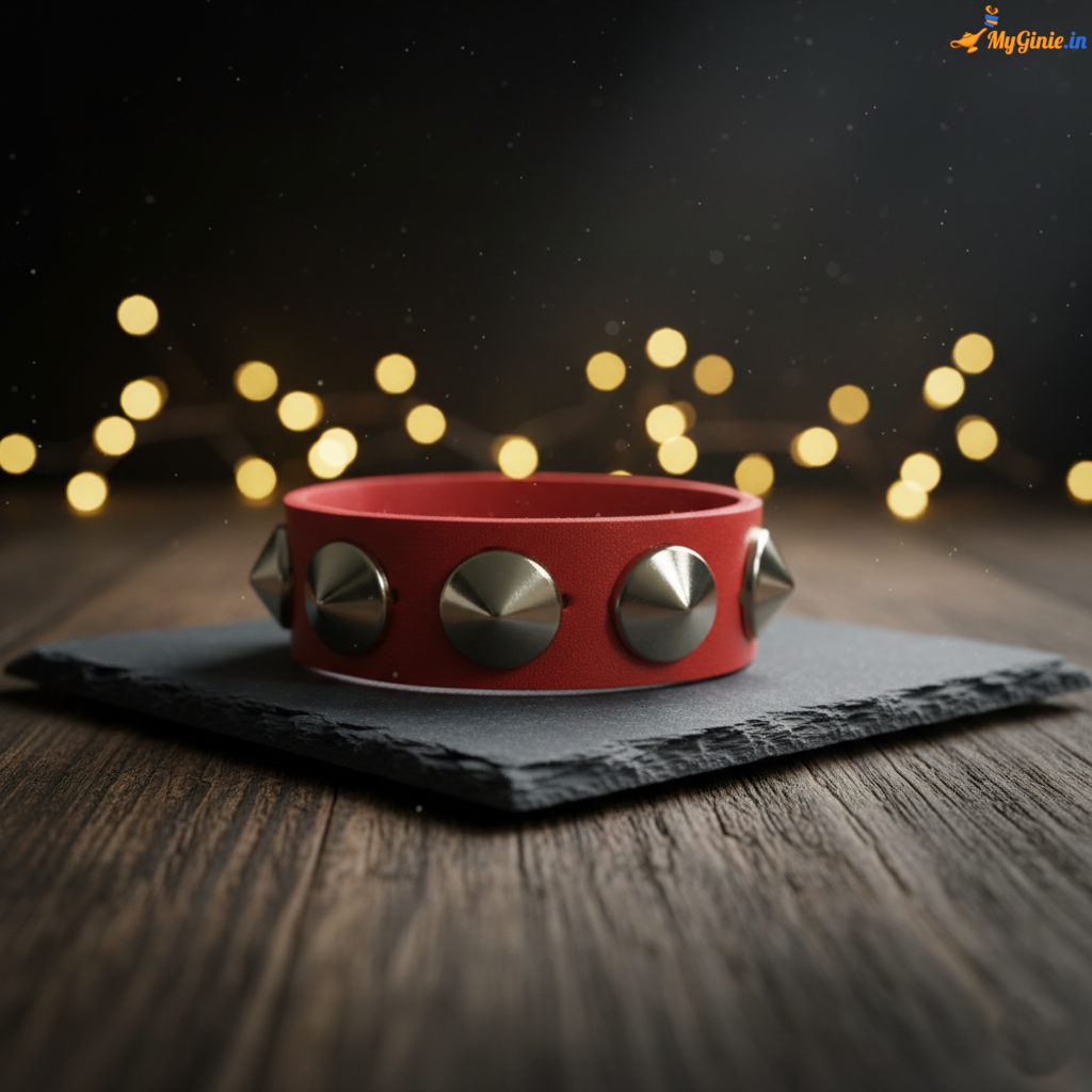 Trendy unisex leather wrist band 100% leather in red with silver colour metallic charm design this hand band has easy and comfy fit. two rows of buttons, to fit according to fist size.