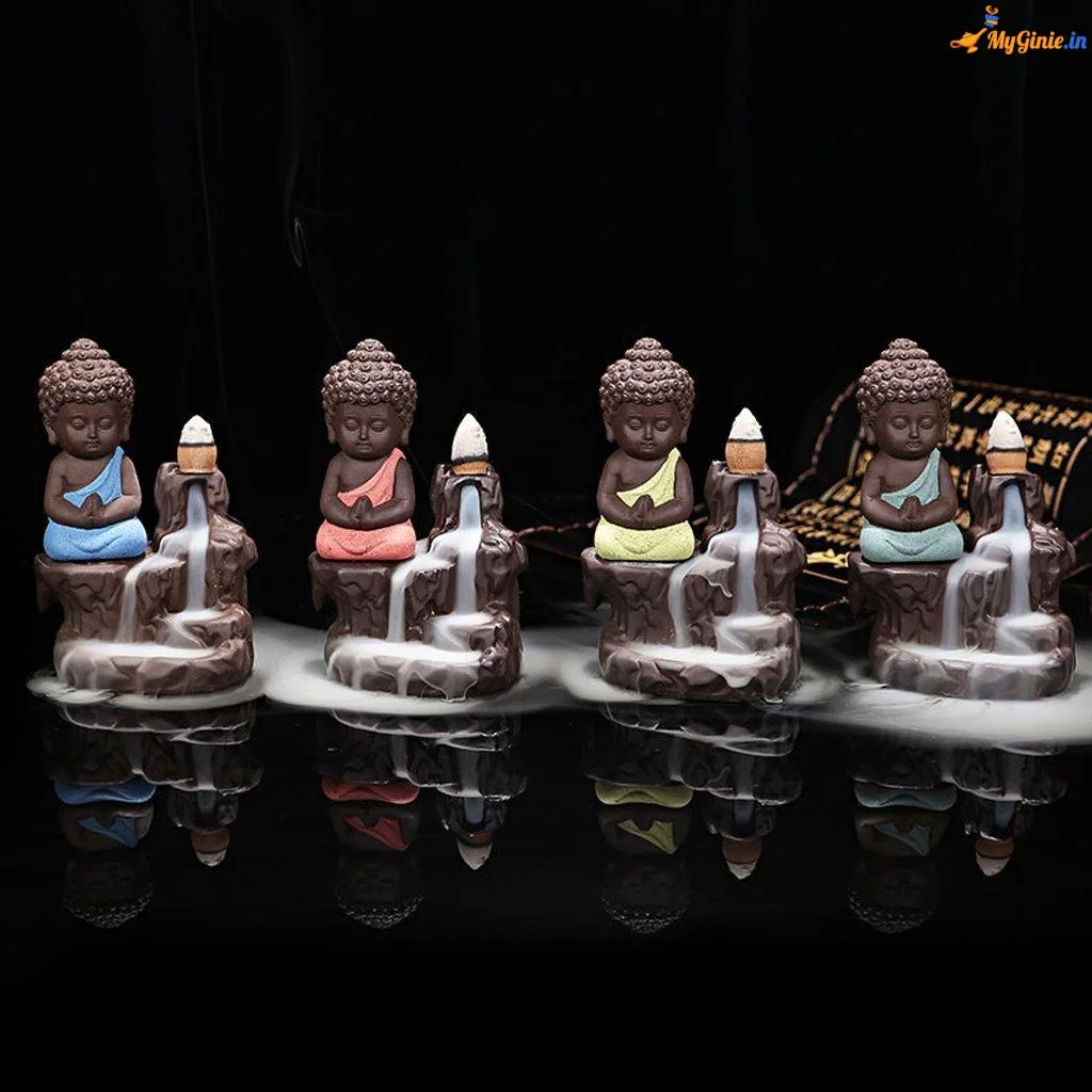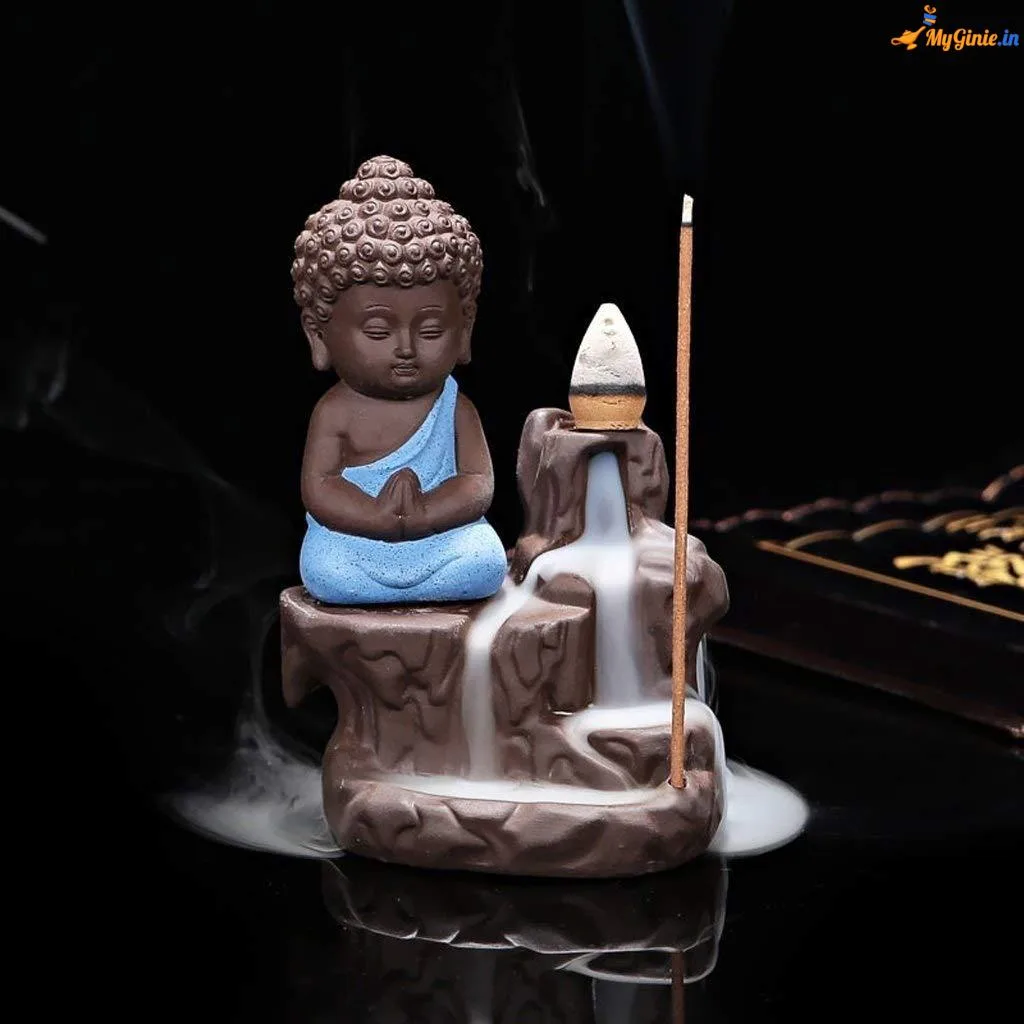 A back-flow incense burner that creates an illusion of a smokey waterfall. This piece of art has lord Buddha sitting and meditating beside the waterfall. Simply place an incense cone at the top of the waterfall, and with the cone’s special properties, the smoke starts to flow in reverse direction, that is from top to bottom, and in-turn creates a beautiful smokey waterfall. With scented smoke flowing in waves beside the Buddha, this makes the perfect gift for anyone!