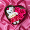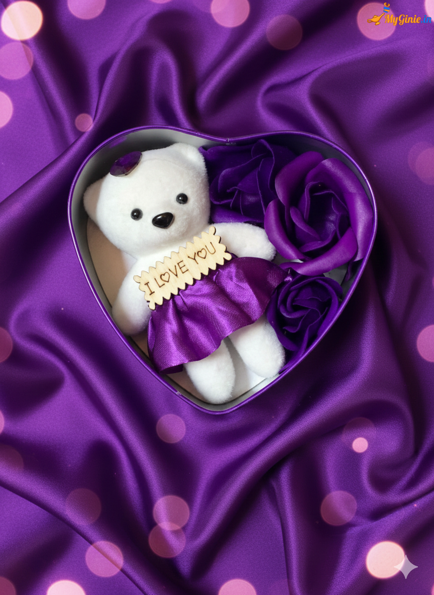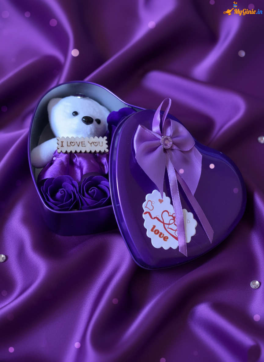 Big Heart Shaped Tin Box Bear With Rose Soap Flowers Purple Colour