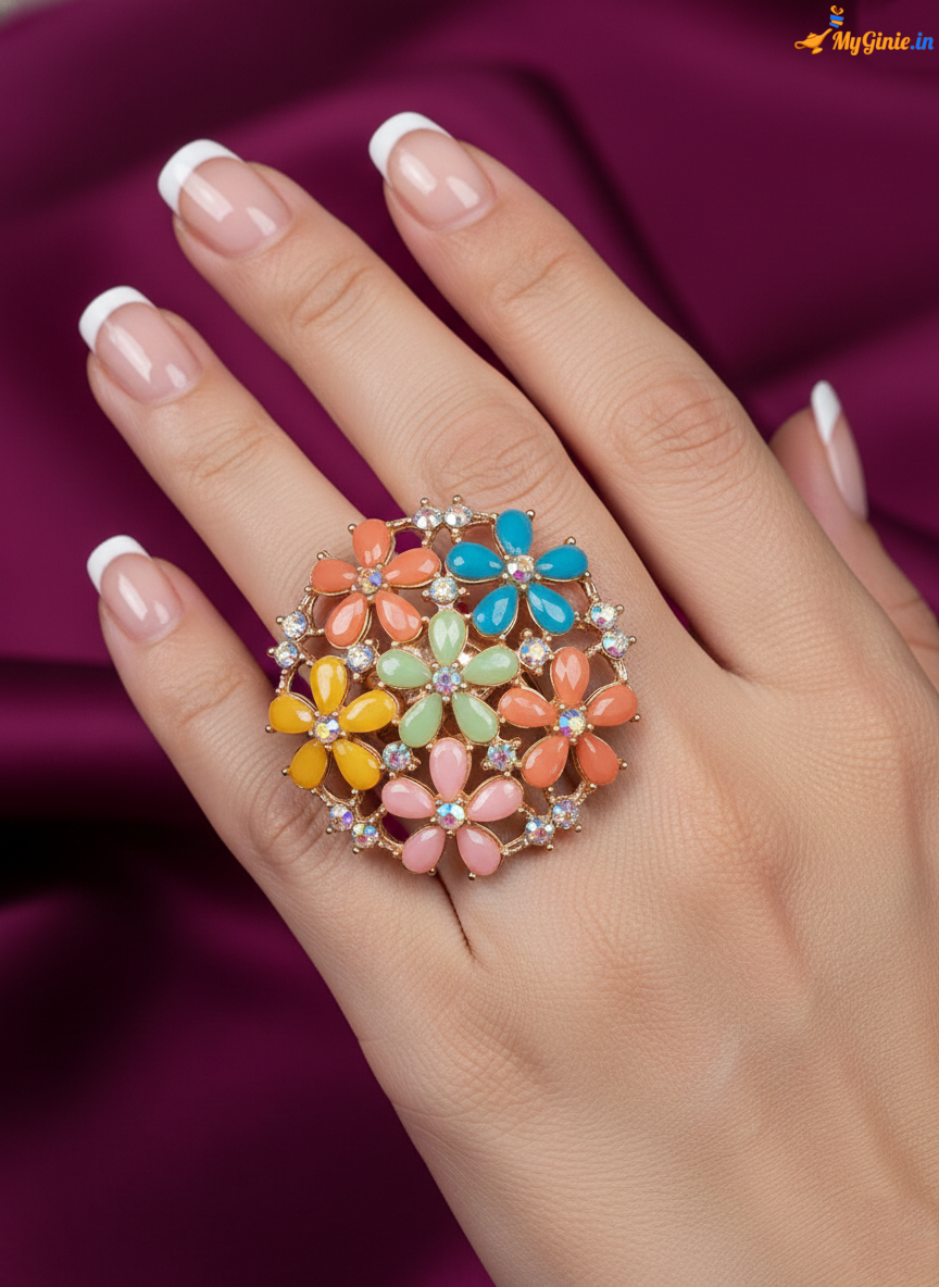 Myginie Gifts Private Limited brings exclusive Fashion Jewellery designs to your doorstep with the utmost ease. This beautiful and contemporary Jewellery is made with finesse. Each and every detail has been taken care while designing and manufacturing this product. Add glamour to your look with this finger ring, exclusively hand picked from a curated collection of exquisite High-end Fashion Jewellery. Perfect for Parties, Dinner, Dance, Movies, Birthdays, Anniversary, Gifting, Brunch, Clubbing, etc. Size: Free Size Always store jewellery in a separate box and do not mix it with other jewellery to avoid tangling. Keep it away from water, perfume and other chemicals. Clean it with dry and soft cloth.