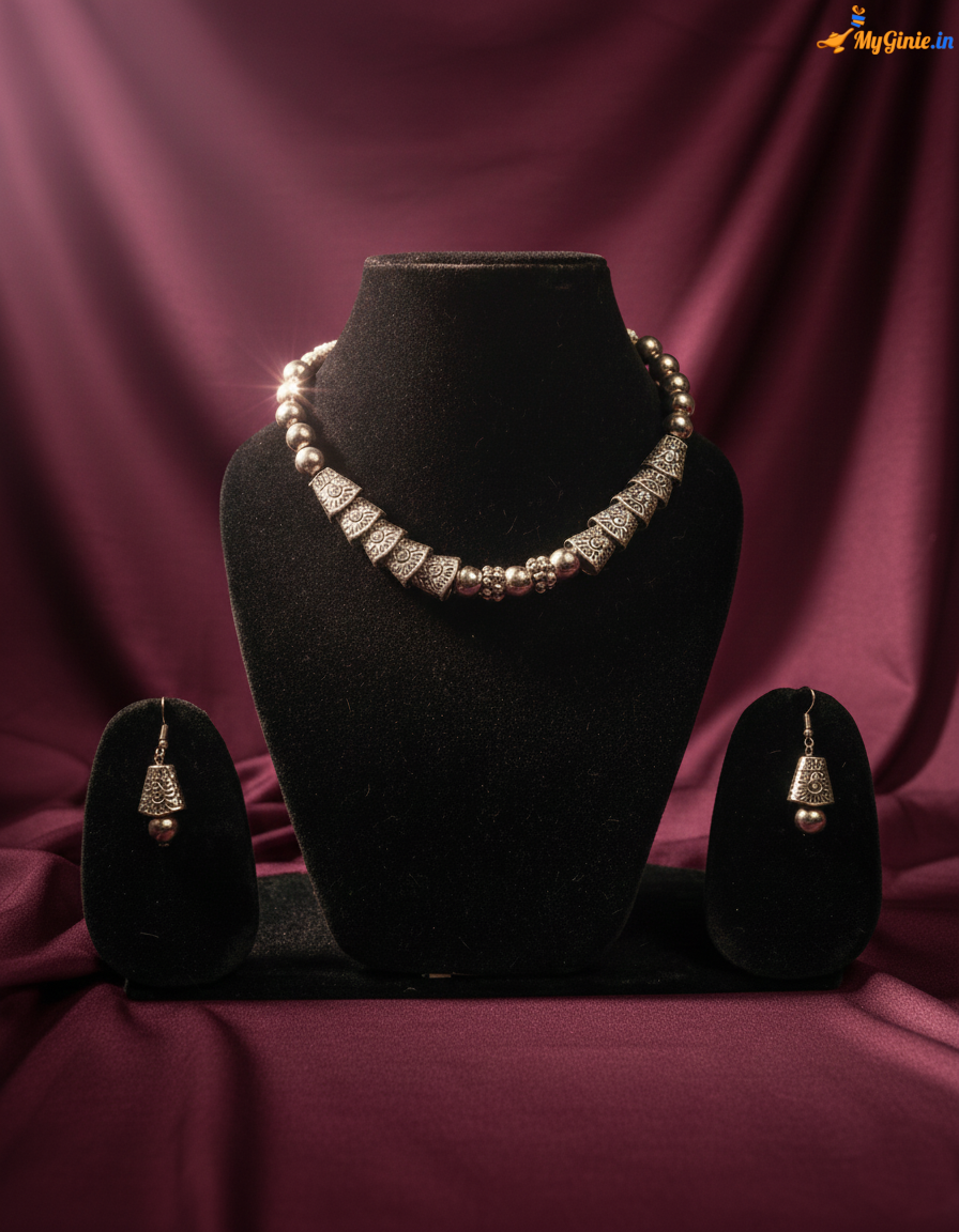- Elegant metallic silver necklace paired with matching earrings for a complete look