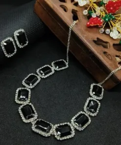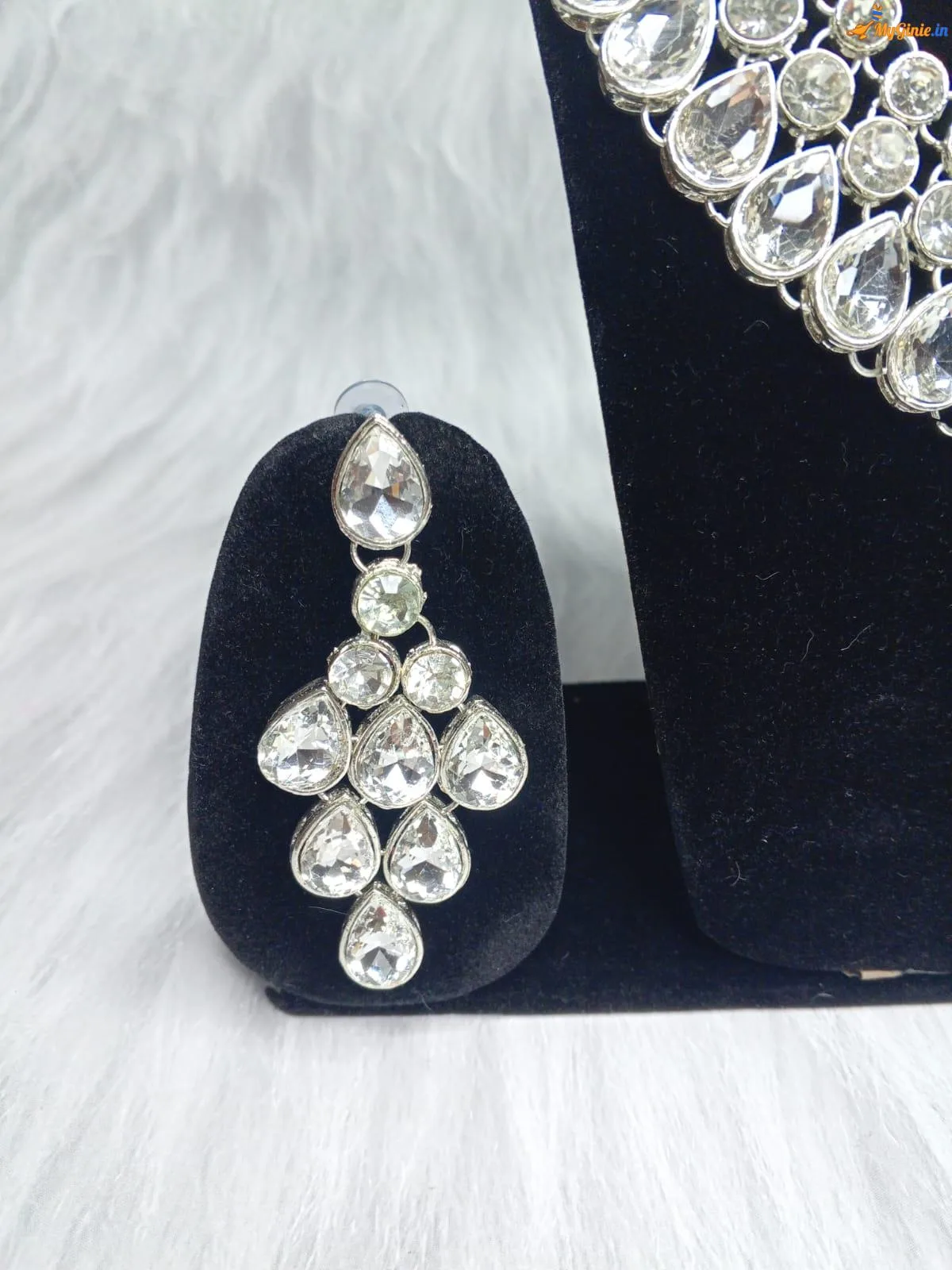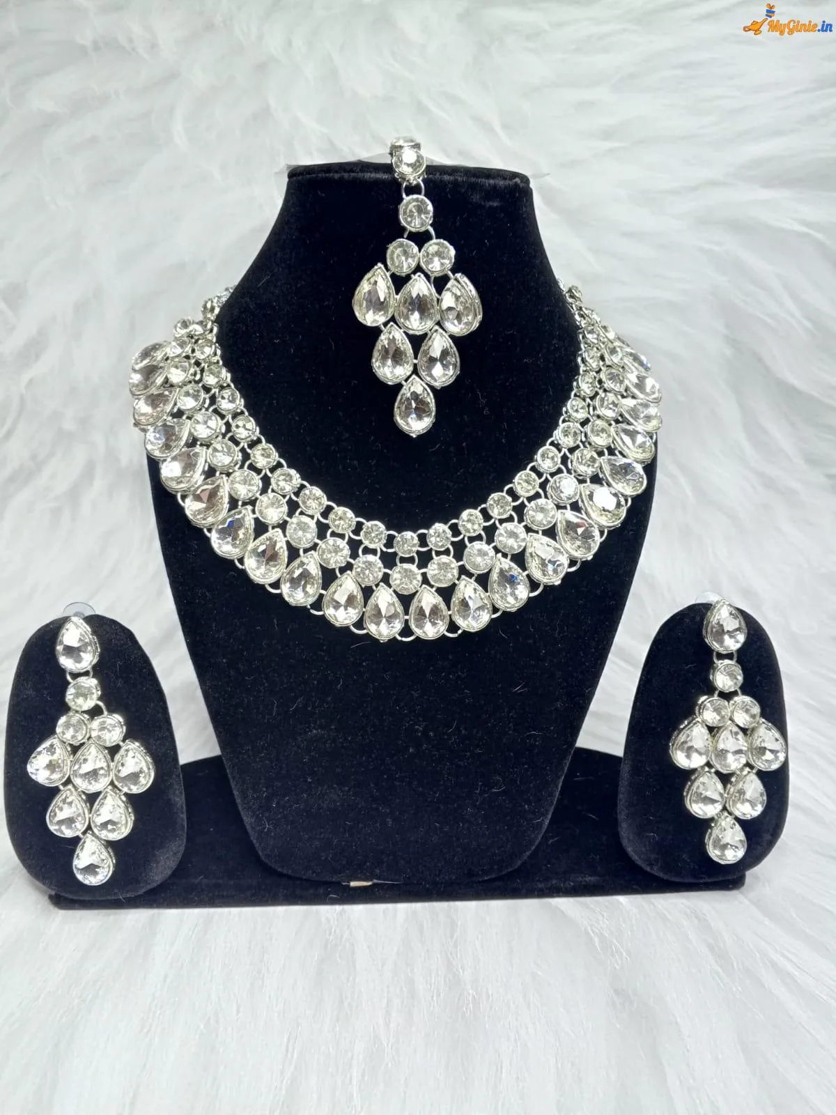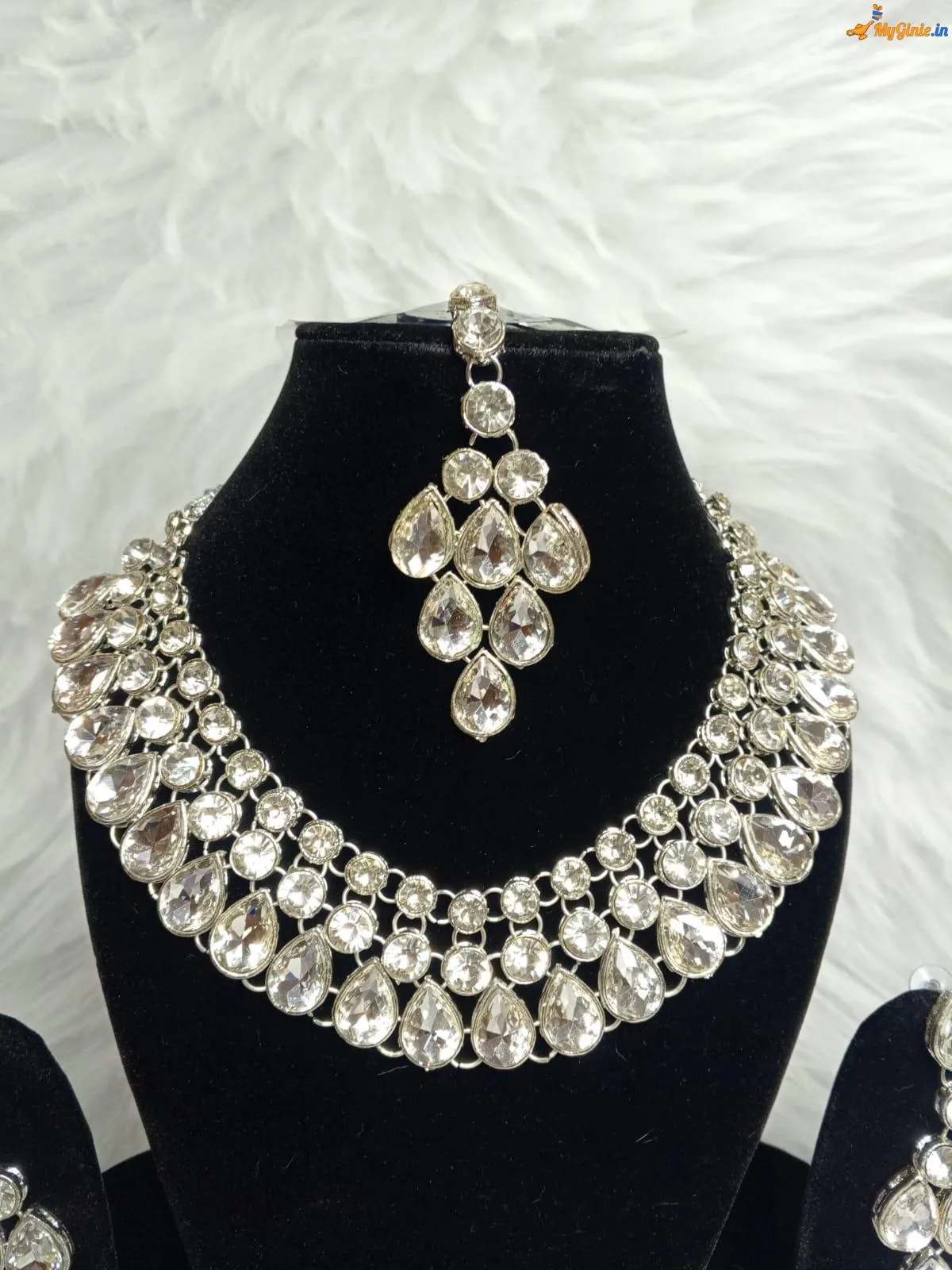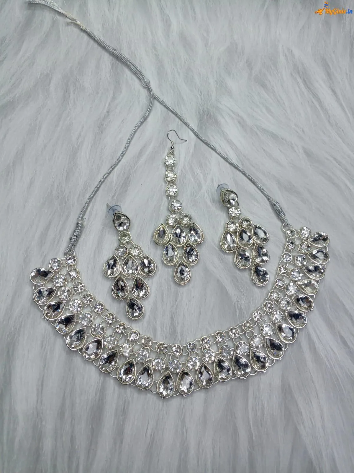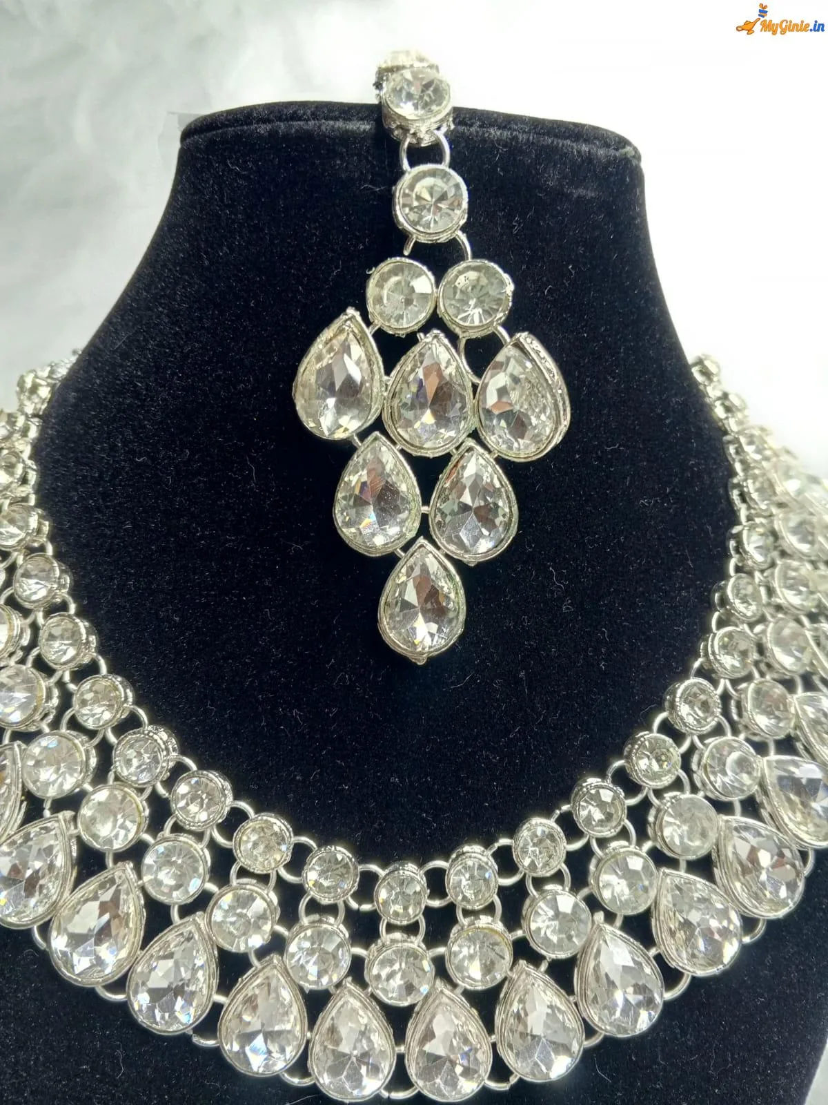 Enhance your traditional look with our Elegant Metallic Silver Colour AD Stones Necklace Set, complete with matching Earrings and Maang Tikka. This stunning jewellery set features intricate AD work that beautifully reflects light, adding a touch of glamour and elegance to any outfit.