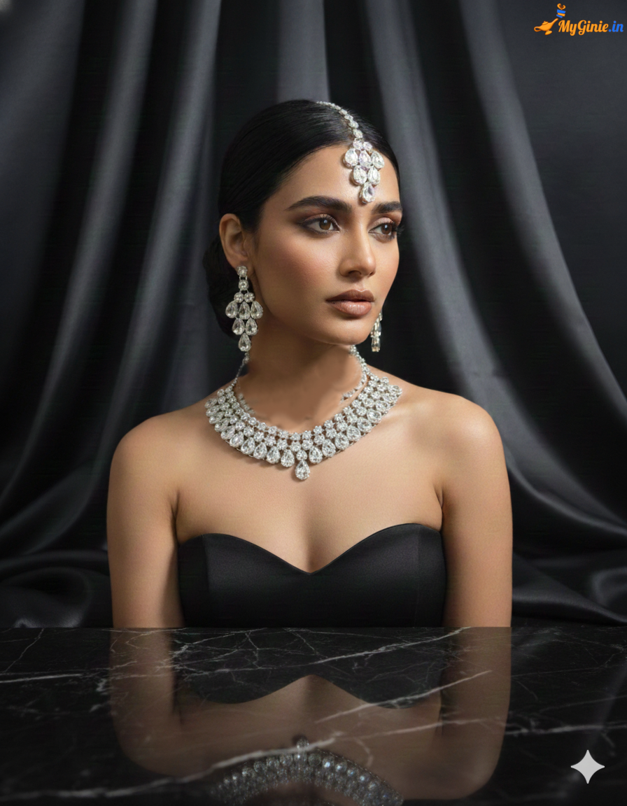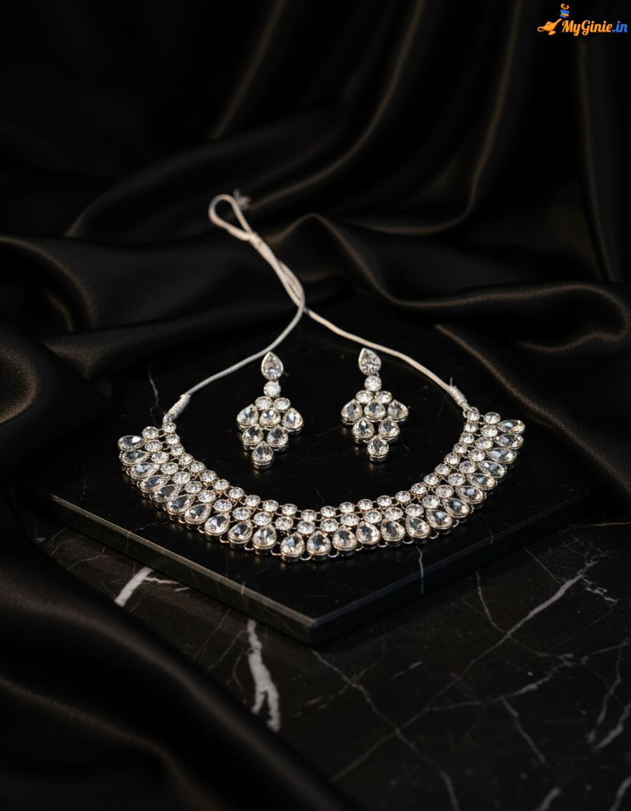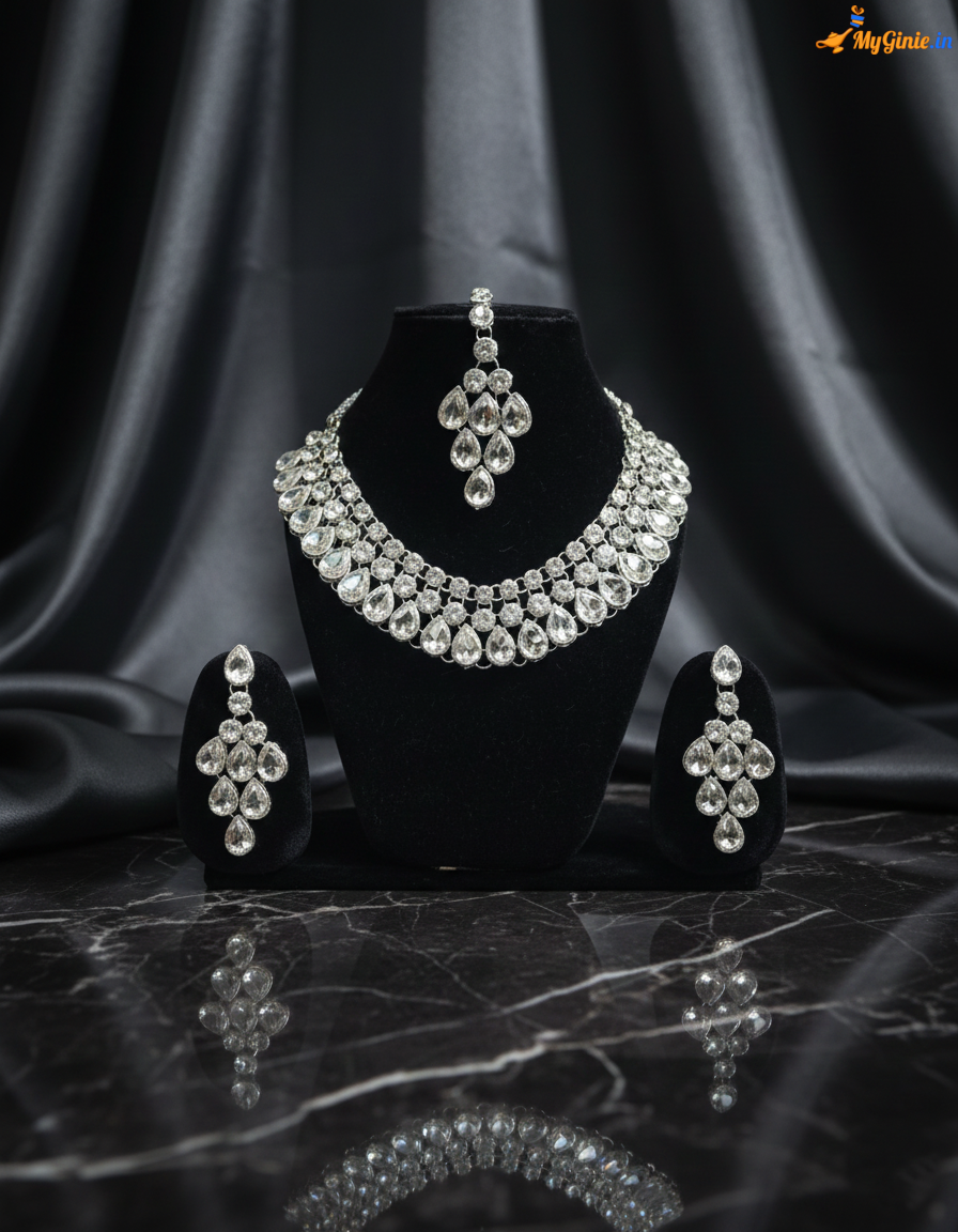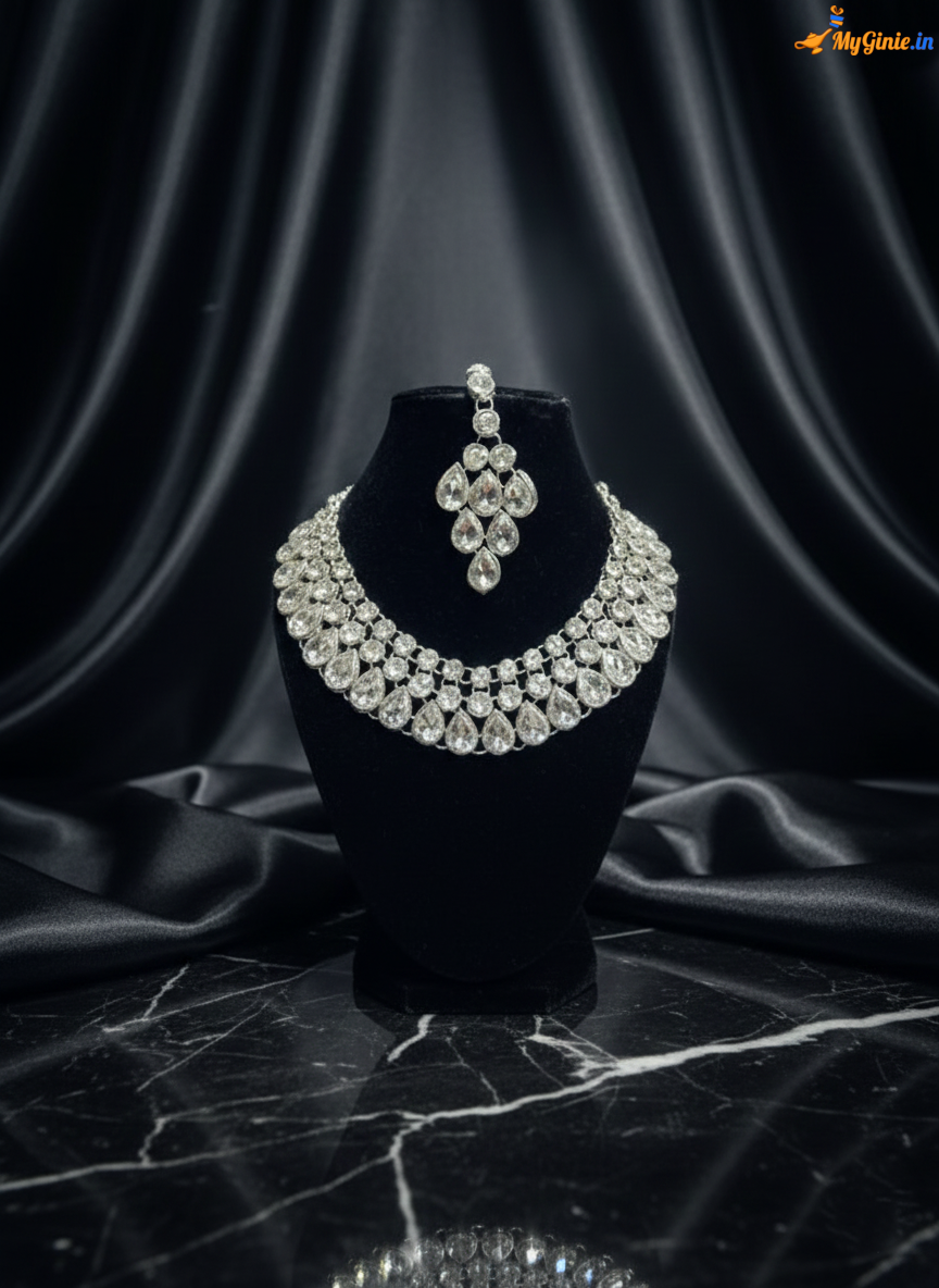 Enhance your traditional look with our Elegant Metallic Silver Colour AD Stones Necklace Set, complete with matching Earrings and Maang Tikka. This stunning jewellery set features intricate AD work that beautifully reflects light, adding a touch of glamour and elegance to any outfit.