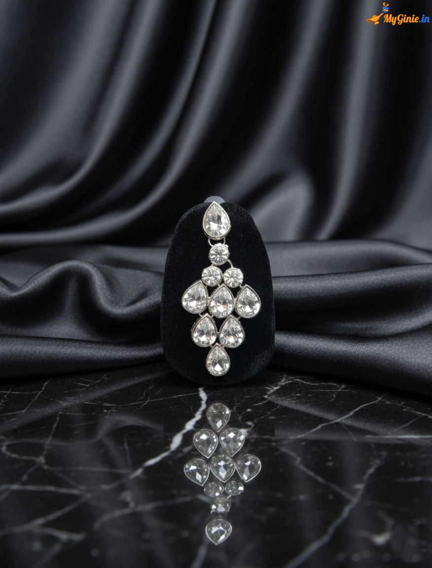 Crafted from high-quality materials, the necklace drapes gracefully around the neck, while the earrings and maang tikka perfectly complement the overall design. Ideal for weddings, festivals, or any special occasion, this set enhances your beauty and showcases your cultural heritage. Make a statement and celebrate your style with this beautiful AD jewellery set—a timeless accessory that embodies elegance and tradition!