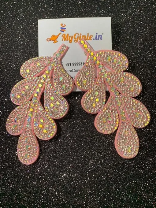 Handmade Embroidery Earring Rhinestones Pink Leaf Design For Women