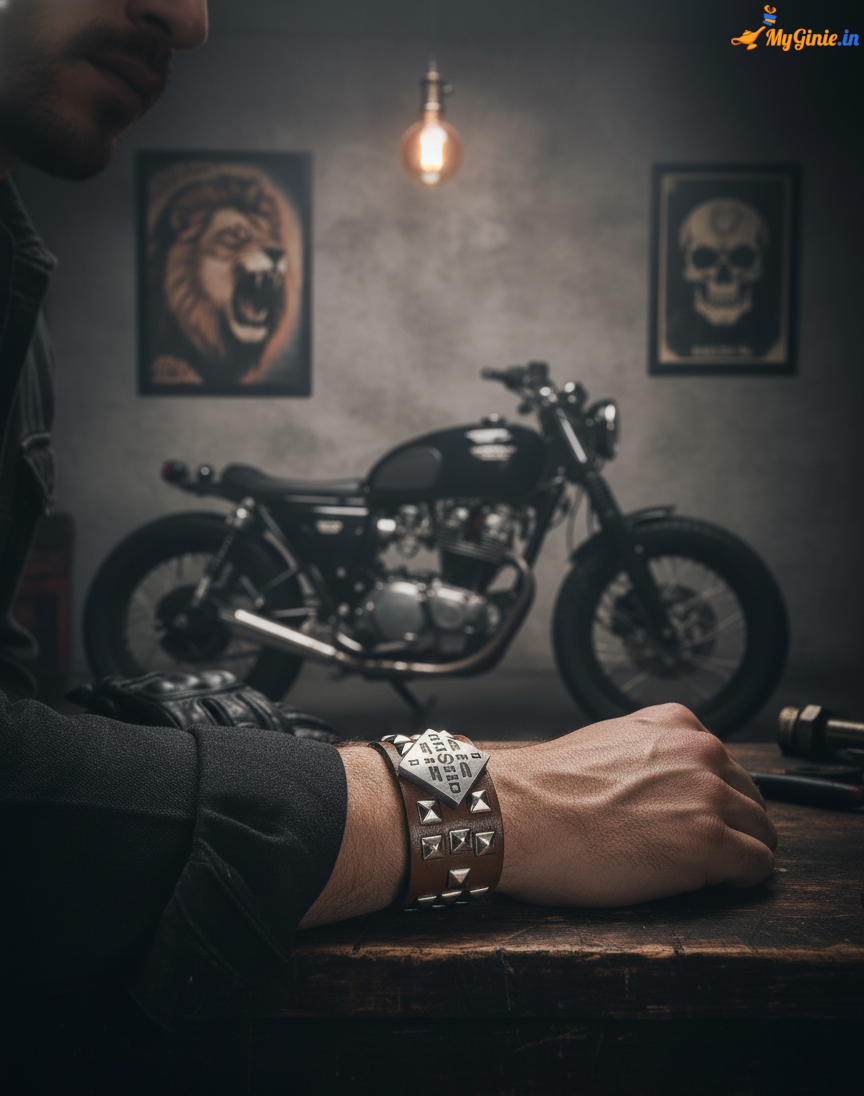 Myginie Gifts Private Limited Wristband Suitable For Casual & Party Wear. Team Up With Denims,T-Shirts,Casual Shirts And Add Funk To Your Overall Look. Trendy unisex leather wrist band leather in blue with silver Colour metallic charm design this hand band has easy and comfy fit. two rows of buttons, to fit according to fist size. SPECIFICATIONS: Weight: 25 Gms. WEARABILITY: Suitable For Casual & Party Wear. Team Up With Denims,T-Shirts,Casual Shirts And Add Funk To Your Overall Look. LOCKING: Buckle Makes it Easy To Wear & Remove, Adjustable Has 2 Buttons For Perfect Fit.