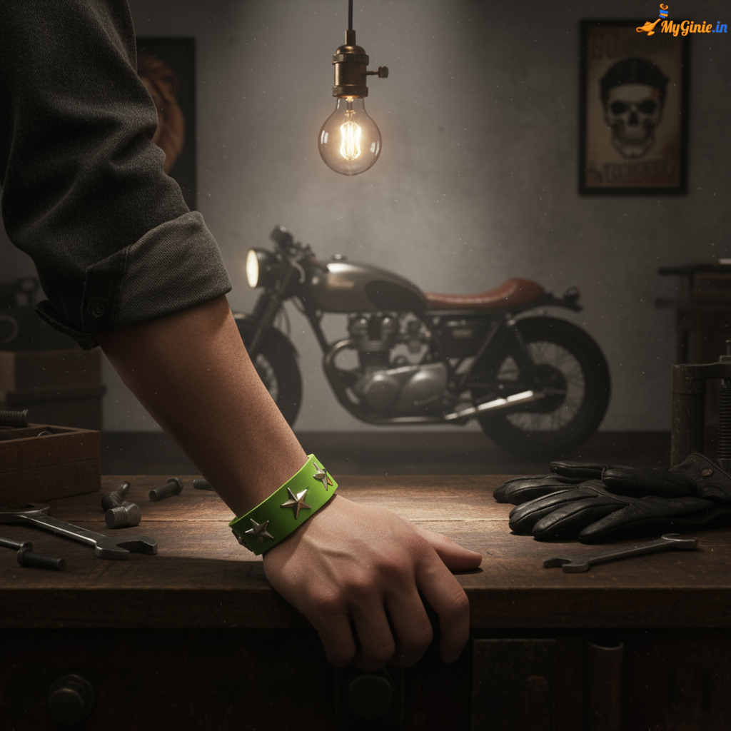 Trendy unisex leather wrist band 100% leather in green with silver colour metallic charm design this hand band has easy and comfy fit. two rows of buttons, to fit according to fist size.