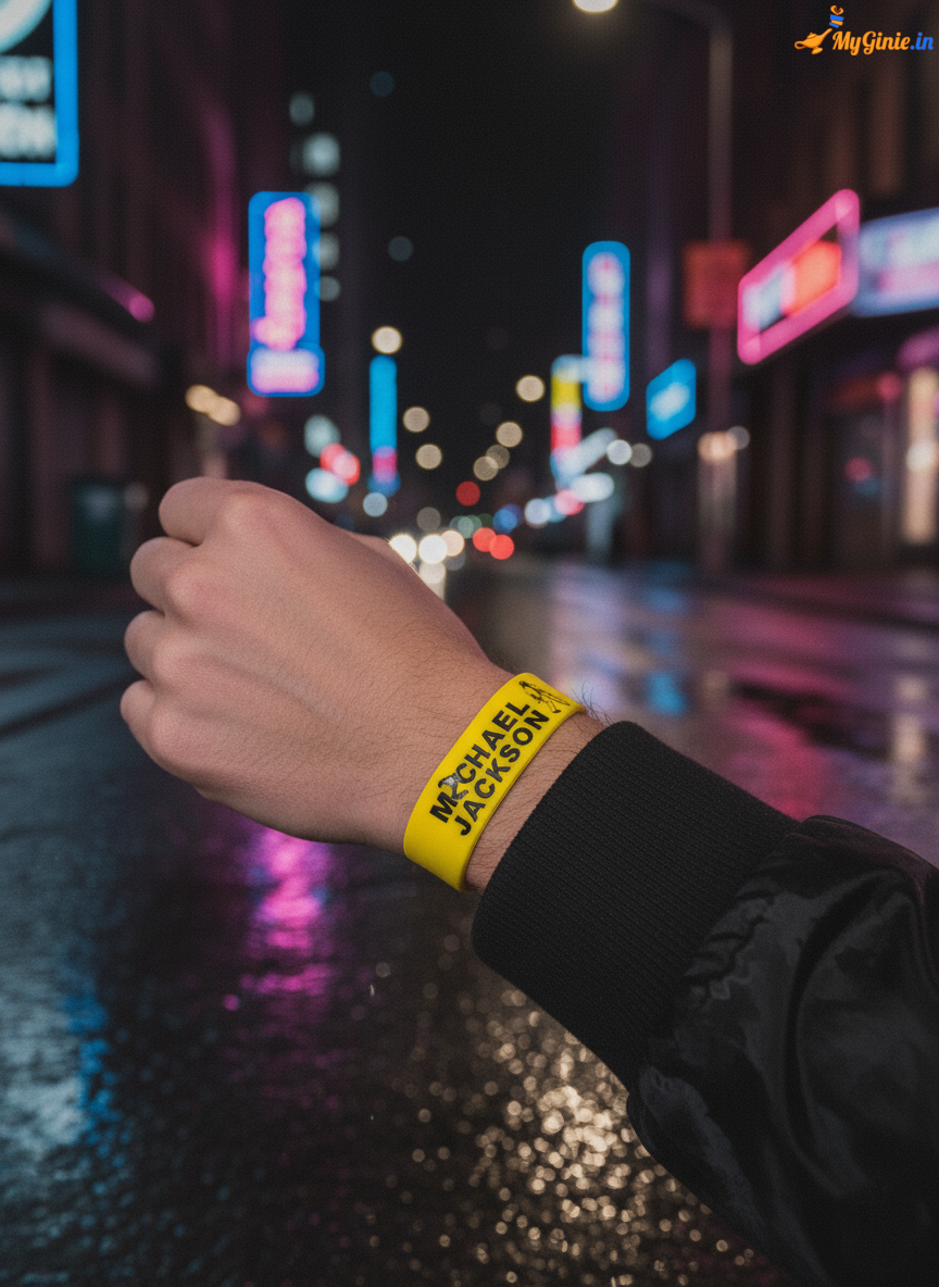 - This wristband proudly features Michael Jackson’s name and iconic motifs, making it a must-have for any true fan.