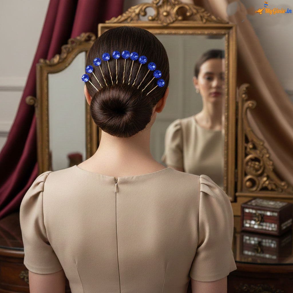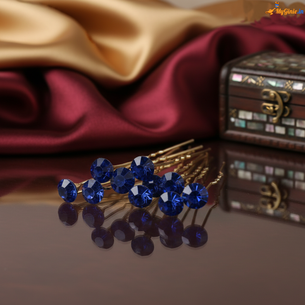 Single Blue Stone Silver Hair Bun Pins For Women and Girls – Set of 12