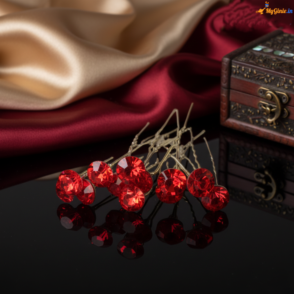 Single Red Stone Silver Hair Bun Pins For Women and Girls – Set of 12