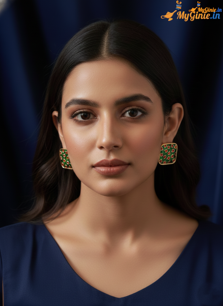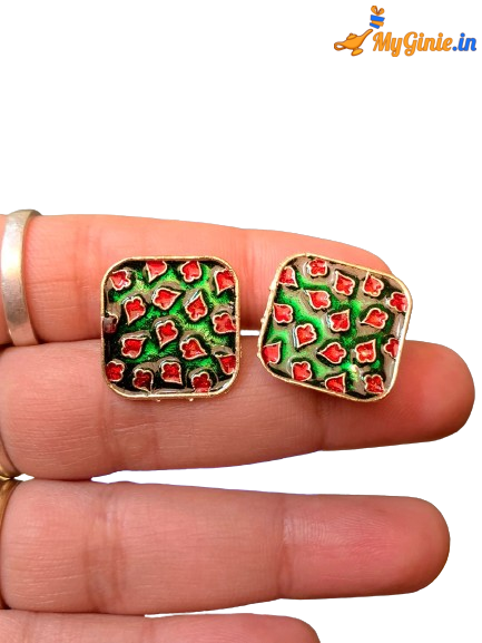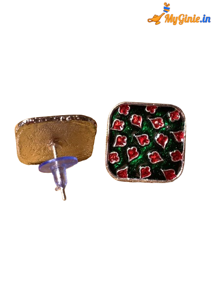 Square Metallic Earring Stud For Women Green And Red Colour