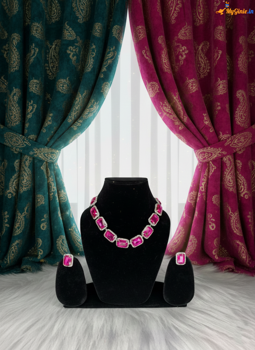 Square Shaped Silver Toned American Diamond Stone Studded Necklace With Earring Dark Pink
