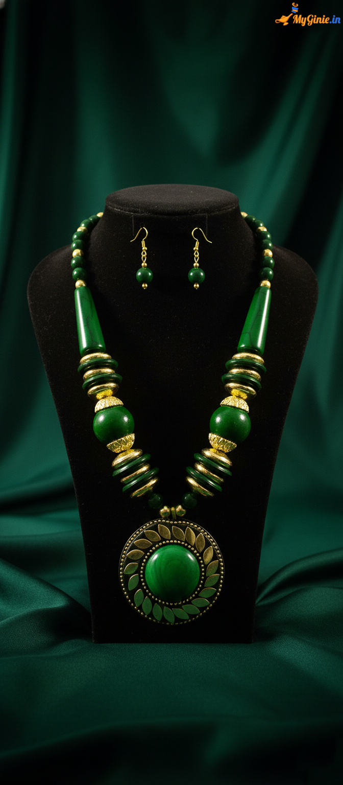 Tibetan Style Handmade Sea Green and Golden Beads Big Pendant Necklace with Matching Earrings