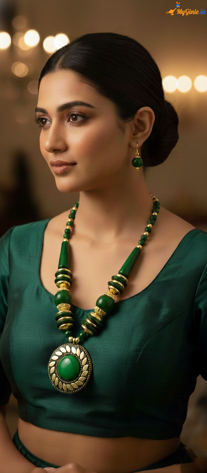 This art Jewellery stylizes with sarees, salwar suits, kurtis or any fashionable trendy dresses, which a women can carry with. This is one of the blistering trends of today’s women Fashion, This is a complete piece of necklace crafted from a lightweight and durable materials. This is a beautiful art form of today’s Fashion Jewellery. This neck piece is a perfect blend of artisan work and use of contemporary designs. This necklace will adorn your neckline with glitter and shine, will exudes class and makes a statement of its own.